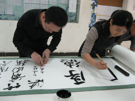 为纪念中国人民抗战胜利暨世界反法西斯战争胜利70周年、联合国教科文组织成立70周年,并倡导和平、展望和谐友好之愿景,由北京市人民对外友好协会、北京市民间组织国际交流协会与中国世界和平基金会共同主办,北京书法学校策划的“翰墨和平”国际友人书画交流活动,于近日走进sunbet申搏工艺美术系书法专业。