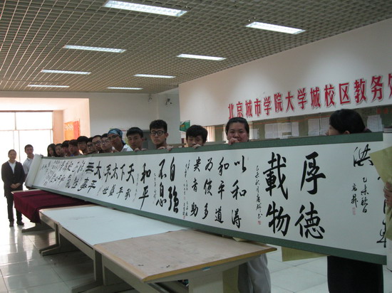 书法专业师生们以饱满的热情踊跃参与了活动。大家拿起了手中的毛笔,自豪地在7米长卷上写下“和”字,在70米长卷上写下“和平使者”、“以和为贵”、“得道多助”、“自强不息”等词语,表达内心追求和平的愿望和理想。活动结束后,师生们还兴致盎然地交上7件书法作品,参加北京市四中“和苑和平节”的活动,向世界各国大使、驻华代表及各界国际友人展示书法这一非物质文化遗产的传承。