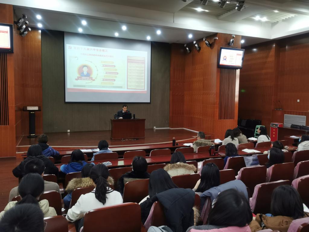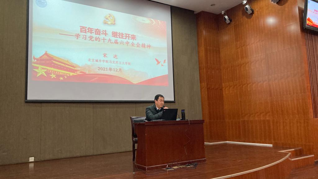 宋达老师首先从党的各次中央委员会主要议题、改革开放以来历次六中全会时间及审议通过的文件等对党的中央委员会召开情况进行了介绍,接着概述了十九届六中全会的两个重要决议、会议公报和习近平总书记“关于《中共中央关于党的百年奋斗重大成就和历史经验的决议》的说明”,并从“勿忘昨天”“无愧今天”和“不负明天”三个方面对十九届六中全会精神进行了重点讲述。