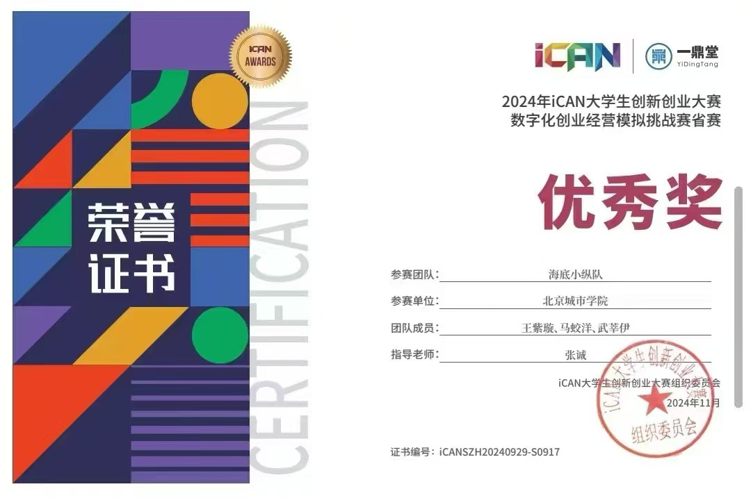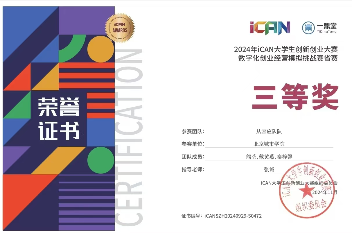 12月16日,经管学部学生在2024年iCAN大学生创新创业大赛数字化创业经营模拟挑战赛全国总决赛获奖。经管学部代表队经过激烈的角逐,将多项大奖尽收囊中,载誉而归。杨继民、李瑞、袁悦团队获得省赛一等奖、全国三等奖的佳绩,熊荃、戴黄燕、秦梓馨团队获得了省赛三等奖,王紫璇、马蛟洋、武莘伊和张喆两支队伍获得优秀奖,指导教师张诚为同学们提供详细的赛事指导。企业模拟经营创行协会负责本届竞赛的所有校内组织环节。