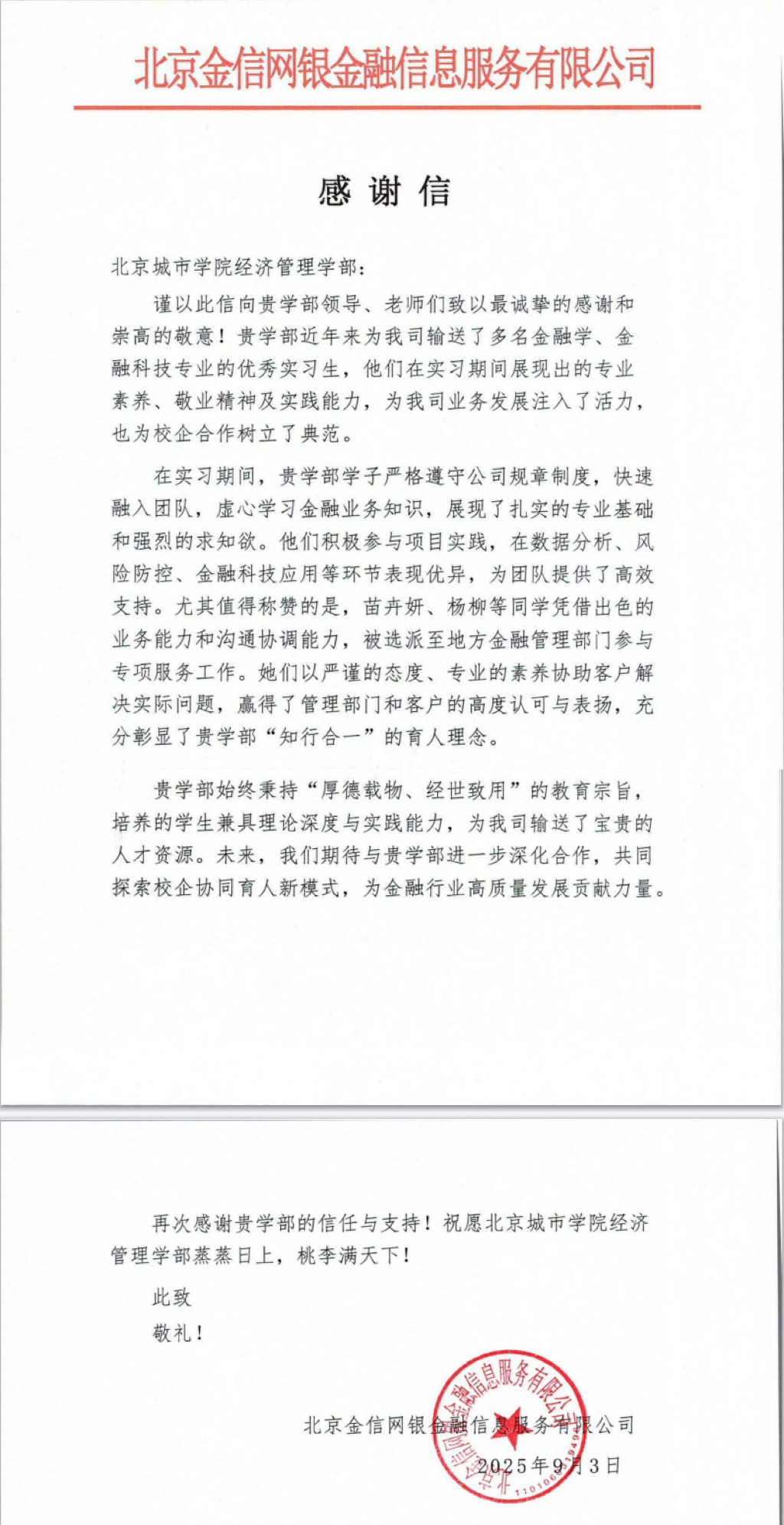 近日,经管学部收到北京金信网银金融信息服务有限公司发来的感谢信,信中高度赞扬了金融科技、金融学专业学生在实习期间展现出的专业素养、敬业精神及实践能力,特别是在数据分析、风险防控以及金融科技应用等环节表现优异,为公司团队提供了高效支持。同时还特别提到22级实习生苗卉妍、杨柳等同学因表现突出被公司选派至地方金融管理部门并赢得该部门和客户的高度认可与表扬。