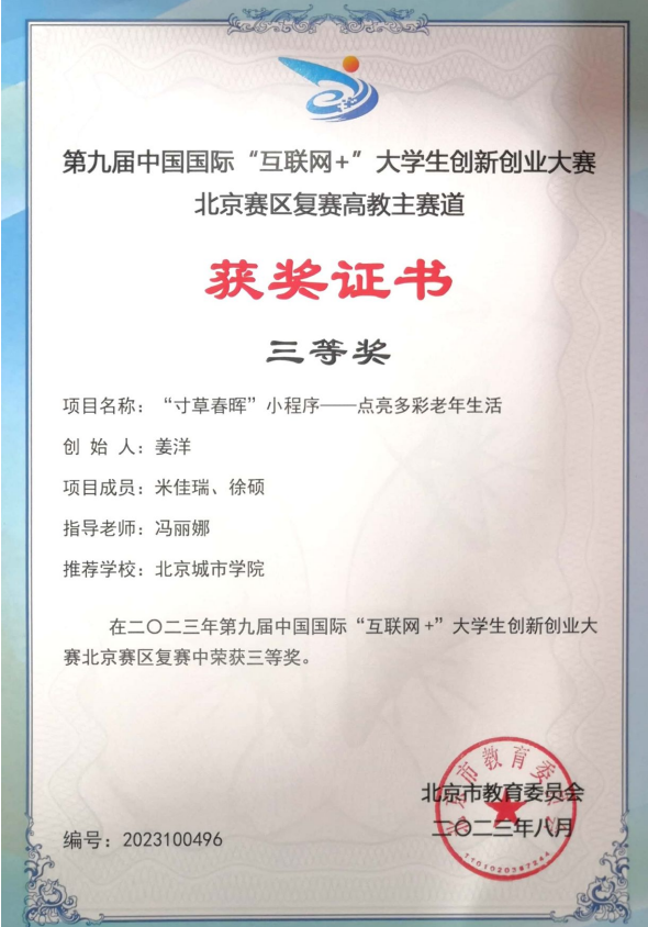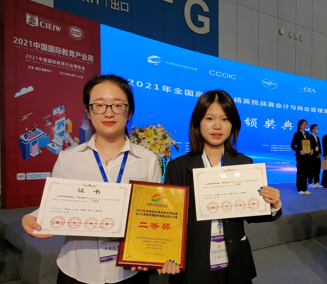 (四)学生获得“挑战杯”首都大学生创业计划大赛奖项:从2008年开始,会计专业学生开始参与该大赛,初选参赛项目累计约185项,进入复赛项目累计达12项,参与学生累计约500人。获得北京市金奖1项、银奖6项、铜奖9项。其中《“依旧源”北京高校图书旧物循环有限责任公司商业策划书》获得2008年度金奖;2018年陆续有2个项目获批入驻北京市高校创业孵化器;2019年7月,专业学生马诗瑶、郭世晋、赵文淇团队的《黑水虻农业生态循环经济设计方案》项目荣获2019年首届北京市大学生节能节水低碳减排社会实践与科技竞赛特等奖;2020年专业学生承担的《“趣团花”探索单品花互联网销售新模式》项目成果获得第六届中国国际“互联网+”大学生创新创业大赛三等奖;2023年《“寸草春晖”小程序》项目获得全国“互联网+”大学生创新创业大赛三等奖。