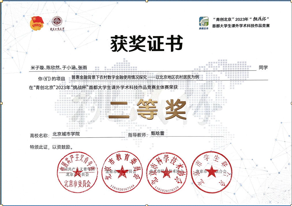 校内实训:课内,设有多门独立设置的实训课程或理论+实训课程,建有虚拟证券交易所、仿真银行、大数据分析等多个专业实训室。功能齐全的现代化教学条件、模拟仿真的实训项目,保证了学生的职业素养和专业技能均能得到有效的训练。课外,依托“金融科技社团”、“黑马训练营”等专业社团、大学生创新创业训练、学科竞赛等开展各项实践活动。学生在“第八届全国证券投资模拟实训大赛”“北京市首届大学生区块链技术应用创新大赛”中,通过python技术、区块链知识等解决专业问题,在竞赛中取得佳绩。同时,学生在企业管理类的学科竞赛中,也获得了市级以上的奖励,充分体现了专业复合型能力培养的特点。