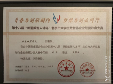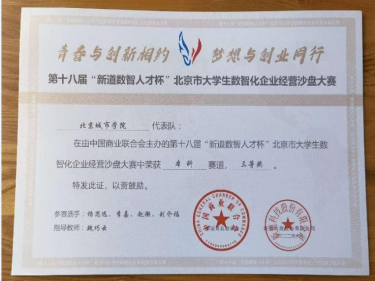 2021年7月10日,由中国高等教育学会高等财经教育分会指导、中国商业联合会主办、中国农业大学经济管理学院、中国农业大学MBA教育中心、新道科技股份有限公司承办的“第十七届北京大学生数智化企业经营沙盘大赛”在线上如期顺义进行。并且,获得了三等奖的优异成绩。