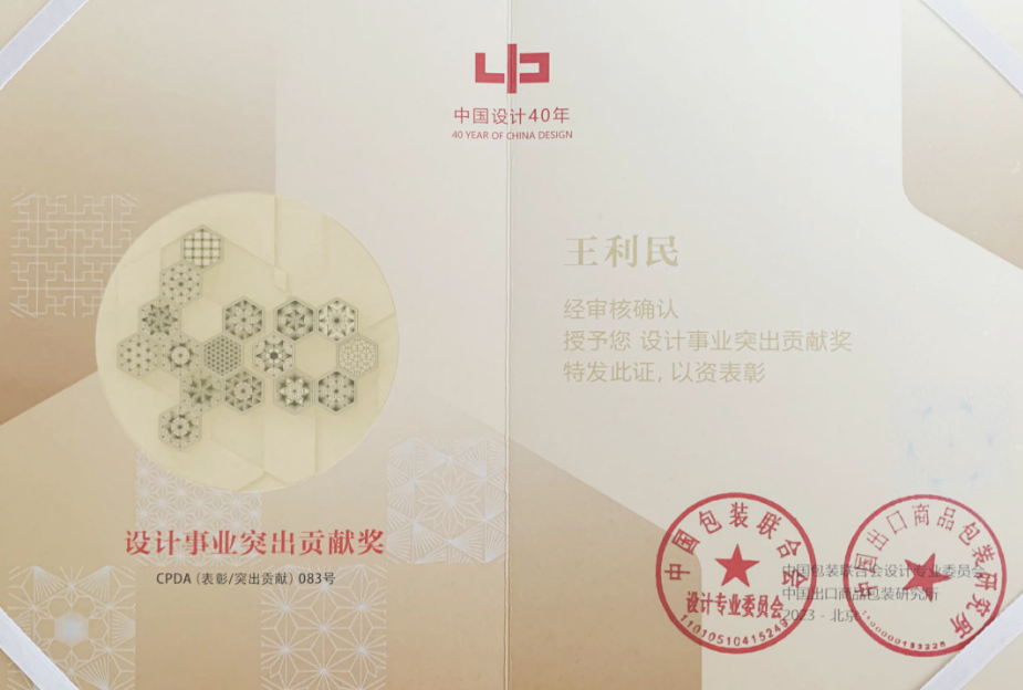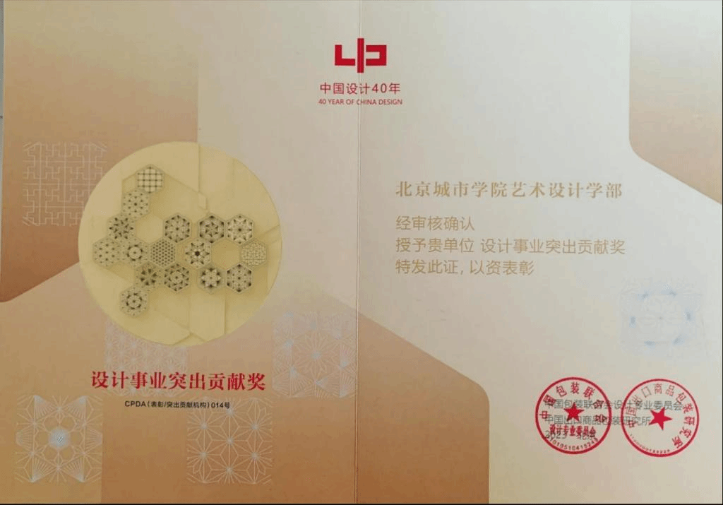 为总结中国包装联合会设计专业委员会成立42周年暨中国之星设计奖创办40周年所取得的成果和业绩,经国家科学技术奖励办公室批准及中国包装联合会设计专业委员会文件精神要求,对长期关心我国设计文化建设、积极配合支持设计委员会、中国之星设计奖工作的个人和机构进行表彰,鼓励其在今后的工作中再创佳绩。本次表彰,共选出“设计事业终身成就奖”26名、“设计事业卓越贡献奖”51名、“设计事业突出贡献奖”(人物)128名、“设计事业突出贡献”(机构)42个、“设计事业新锐奖”(人物)109名、“设计事业贡献奖”(机构)27个。经评审,北京城学院艺术设计学部获“设计事业突出贡献奖(机构)”、王利民教授获“设计事业突出贡献奖(个人)”、秦旭萍教授获“设计事业突出贡献奖(个人)”表彰。