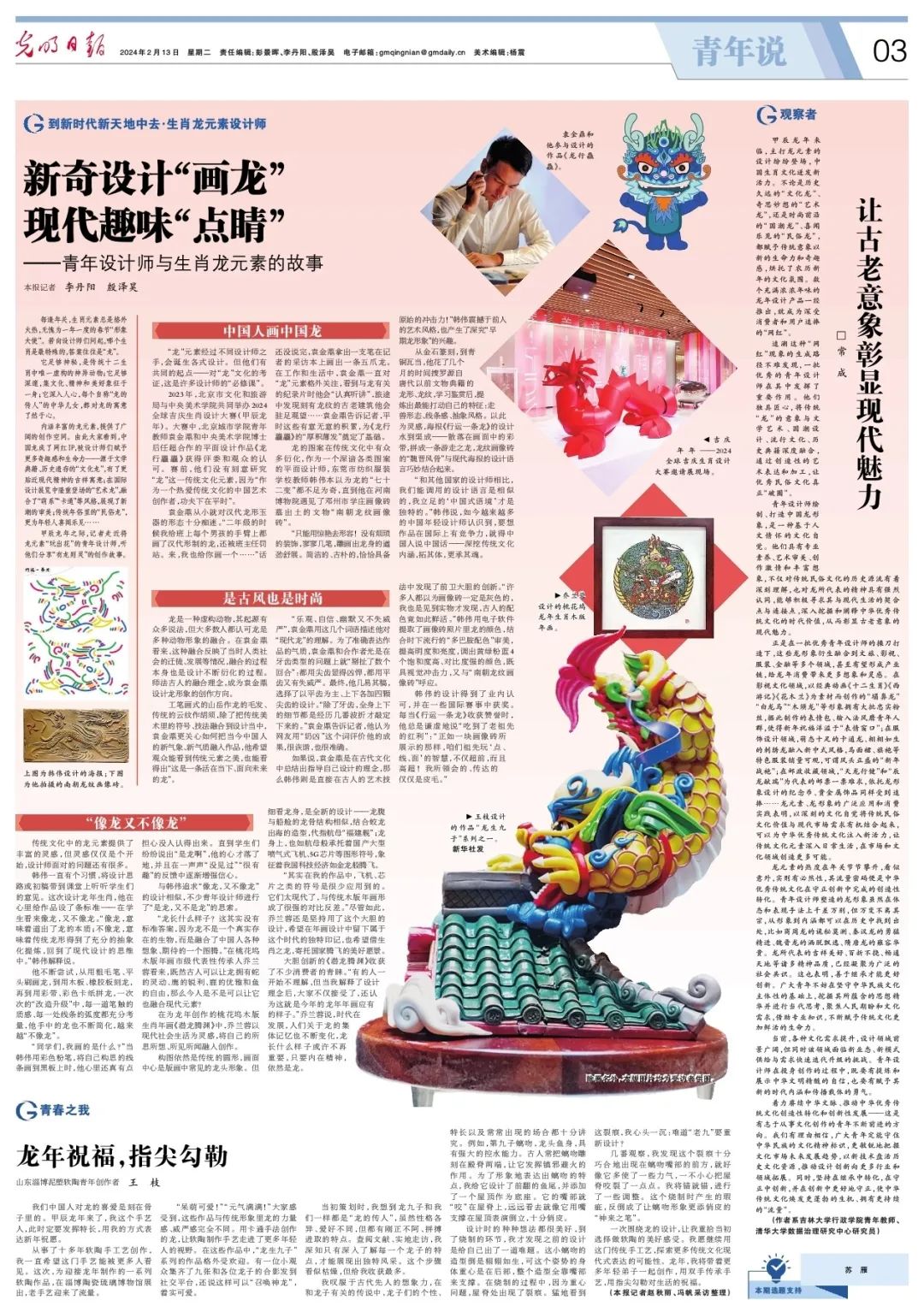 在龙年这个喜庆的年份,艺术设计学部袁金鼎老师喜获佳绩。他参与创作的《龙行龘龘》作品,成功入选 2024 全球集庆生肖设计大赛作品展,并荣获了优秀奖项。这一成就不仅得到了社会的广泛认可,也在展览中极具人气,并在展览现场接受《光明日报》采访。