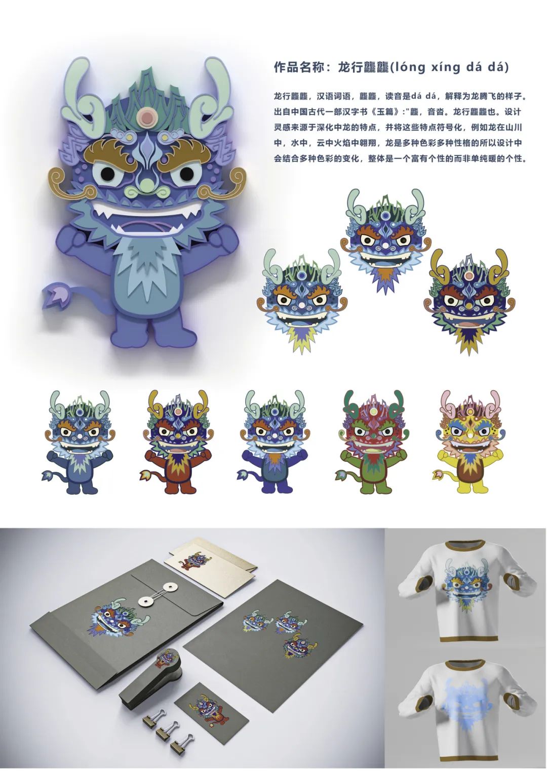 袁金鼎老师在设计作品时独具匠心,充满了创意和故事。在本次比赛中,他与任超博士后合作的作品以龙为主题,通过巧妙的设计手法,将传统文化元素与现代设计理念相结合,展现出了独特的艺术魅力。他们从龙的出现开始研究,并得到了龙是由各种部落图腾组合而成的思路。并将这种方式运用到设计中,结合赛事要求,将山川水火五行元素融入龙的形象设计中,使作品成为中华的代表。在表情设计上也是控制在“自信,乐观,幽默又不失威严”的格调上。为了准确表达作品的气质,也是几易其稿才敲定下来。