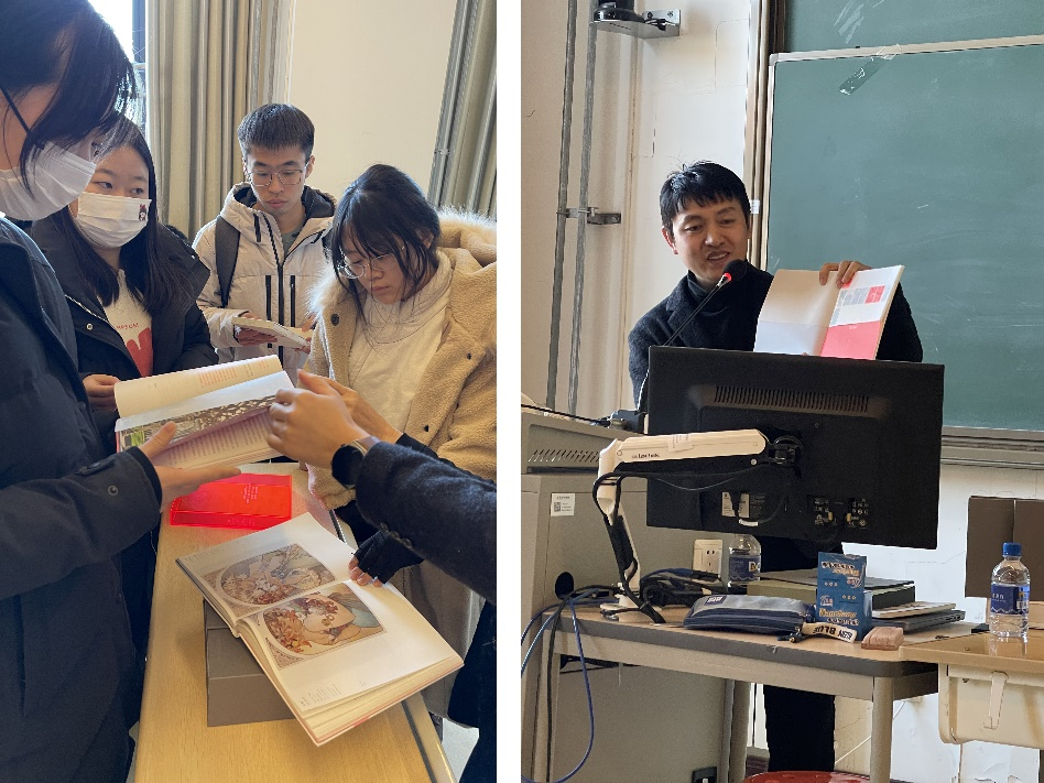讲座伊始,田老师对“7x3”主题进行了阐释:“‘7x3’,‘7’是7本书,‘3’则是书籍装帧设计的三个维度——‘概念编辑设计’、‘编排设计’与‘装帧设计’。” 他认为书籍设计是一个整体,在设计中应该做到书籍内容与设计的统一。同时,田老师为同学们带来了实物的7本书,方便师生们现场触摸与感受纸张与印刷的魅力。