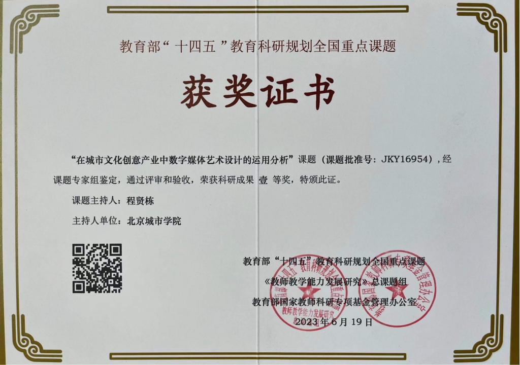近日,艺术设计学部数字媒体艺术专业程贤栋老师参与的“十四五”教育科研规划全国重点项目顺利结题。课题“在城市文化创意产业中数字媒体艺术设计的运用分析”取得卓越成果,荣获科研成果一等奖,并被中国期刊网收录。