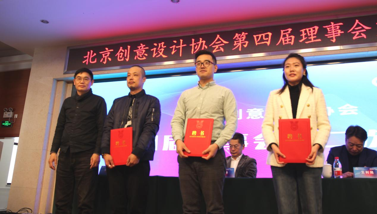 会上,北京创意设计协会第一届理事会副会长马江涛,为新任第四届理事会副会长张继晓、王利民、周俊良颁发聘书。