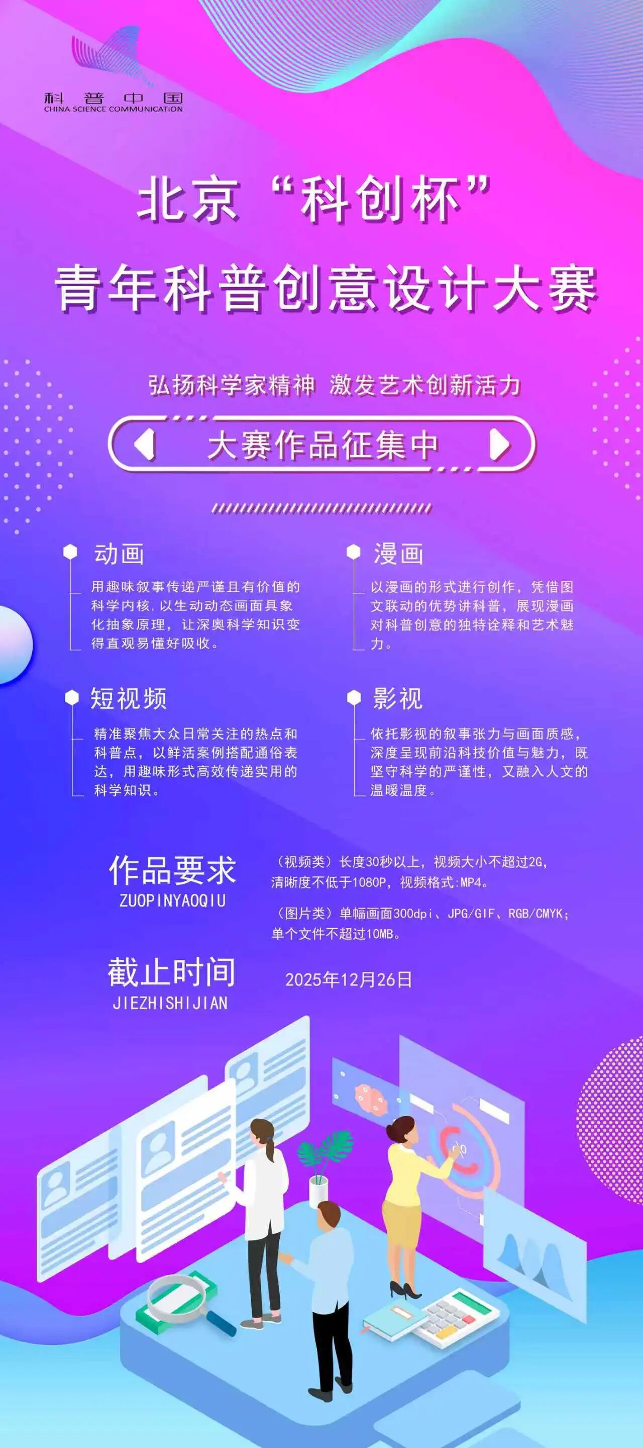 本届“科创杯”青年科普创意设计大赛划分为中小学与高校两个独立赛道。为进一步推动科学知识普及,激发青少年群体对科普内容的兴趣,本届赛事增设涵盖漫画、动画及短视频等多种形式的艺术设计作品竞赛单元。