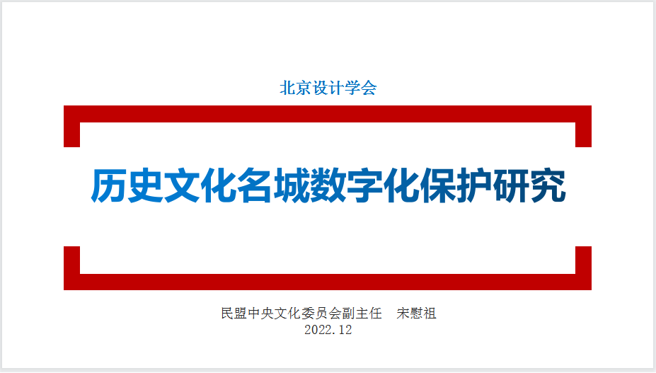 北京市政协常委、社法委副主任、民盟中央文化委员会副主任、北京设计学会创始人宋慰祖主委,以“历史文化名城数字化保护研究”为题,从文化名城如何使用数字化手段进行保护等方面做了精彩演讲。宋主委围绕不同案例,讲述了如何运用现代技术,更好实施老城文物的预防性保护与活态化展示,不断提升文物保护与传承水平,为设计工作者提出了一系列新的研究课题和方向。