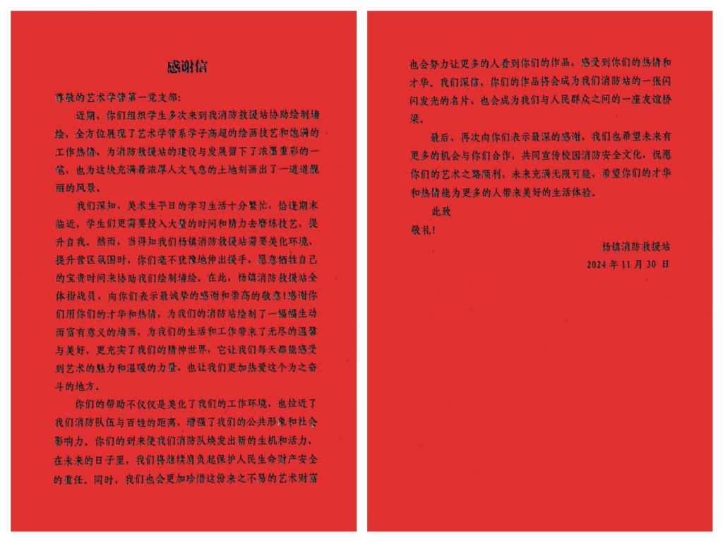 近日,杨镇消防救援站向sunbet申搏艺术学部学管第一党支部发来感谢信,感谢支部携手杨镇消防救援站,成功举办了一场意义非凡的墙绘志愿服务活动。在这场历时一个月的活动中,30余名富有才华与热情的艺术设计学部学生利用课余时间走进杨镇消防救援站,用画笔为消防战士们的生活空间增添了亮丽的色彩,展现出了专业的绘画水平和无私奉献精神。