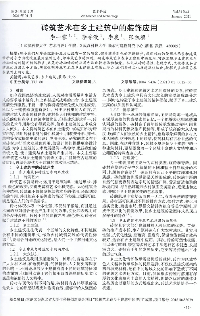 2021.01 在《艺术科技》中发表论文《砖筑艺术在乡土建筑中的装饰作用》