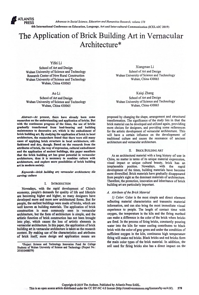2020.02 在ICELAIC2019中发表论文《砖筑艺术在乡土建筑中的应用》