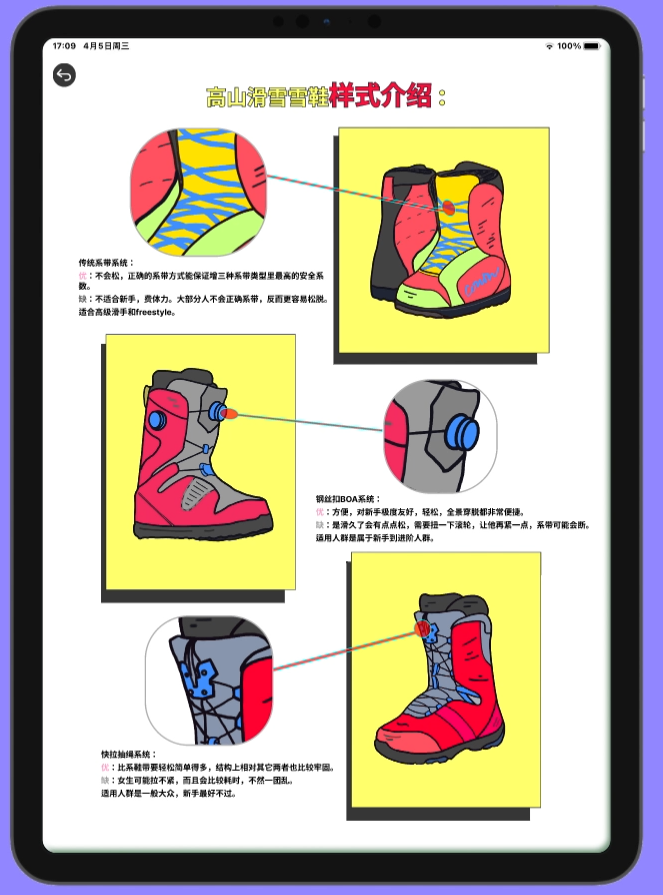 作者打造了一款有关高山滑雪的信息可视化应用设计,其目的是为了拓宽高山滑雪的普及面,让更多的年轻人了解高山滑雪的规则,热爱高山滑雪。本次的毕业设计《冬奥之高山滑雪信息可视化应用设计》笔者以可视化的方式去呈现冬奥赛场上高山滑雪的基本规则和装备细节。比赛规则主要包含两大类:速度类项目、竞技类项目。装备细节主要包含雪镜、雪鞋、雪杖、雪板如何选择的科普,以上内容都有助于新手在雪场更好地进行实践。创作过程中,笔者将以插画形式进行视觉上的呈现,手绘以上提及的所有内容,其次借助交互动效、可视化图表、来丰富的视觉效果。