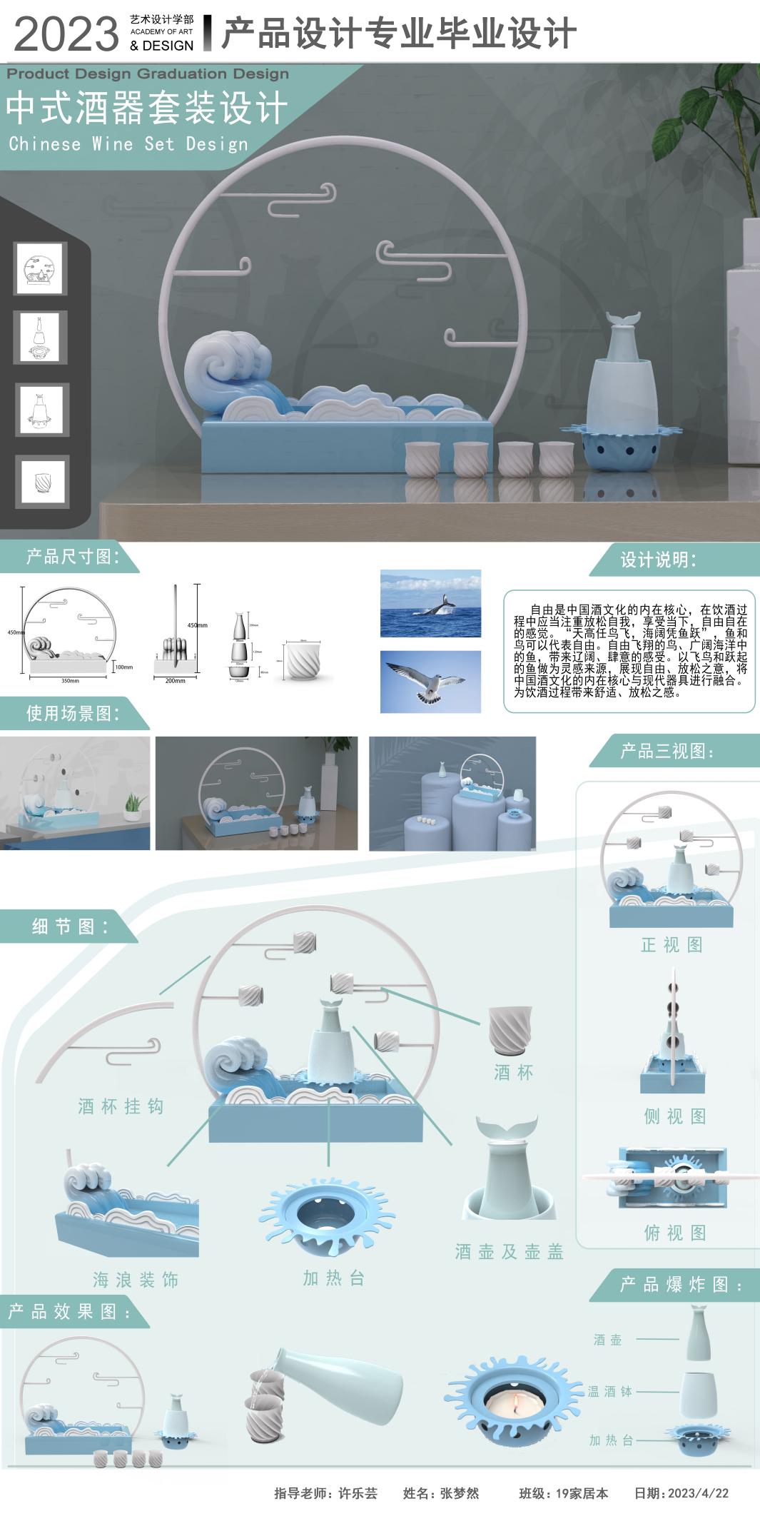 自由是中国酒文化的内在核心,在饮酒过程中应当注重放松自我,享受当下,自由自在的感觉。 “天高任鸟飞,海阔凭鱼跃”,鱼和鸟可以代表自由,自由飞翔的鸟、广阔海洋中的鱼,带来辽阔、肆意的感受。以飞鸟和跃起的鱼作为灵感来源,展现自由、放松之意,将中国酒文化的内在核心与现代器具进行融合。为饮酒过程带来舒适放松之感。