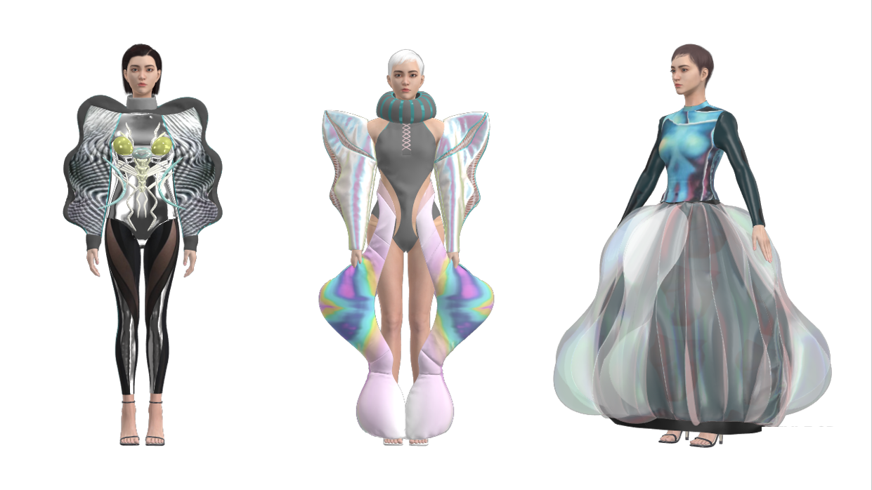 我运用仿生水母与金属异形的廓形结合来体现未来世界的美轮美奂。三款设计分别运用3D打印技术、数码印花与热成像技术,整体服装呈现出一种五彩斑斓的效果,既强调在风格上发扬个性,又尽力探索未来主义风格的服装形式。