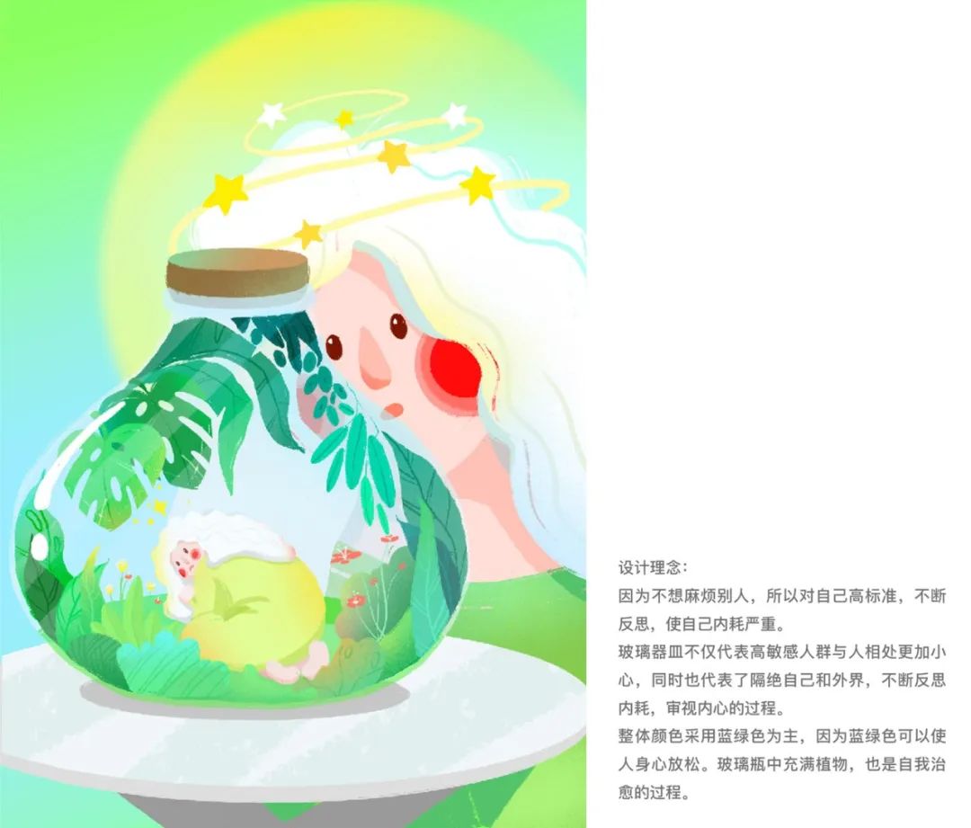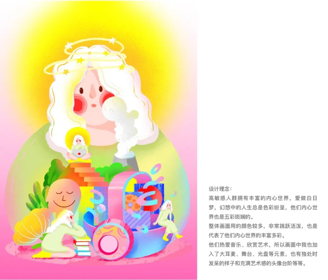 在心理学领域高敏感人格(HSP)是一种比较稳定和持久的人格特征,它不是症状也不是疾病,具备这种人格特征的人约占世界总人口的20%左右,也就是说在我们的身边,每五个人中就会有一个是高敏感人格。本次设计主要围绕“解读高敏感人群”进插画绘制,画面整体以扁平插画风为主,再加入纹理效果的表现,使画面更加丰富。配色会根据每张画面的主题来总结合适的颜色,颜色也以高饱和度、弥散光渐变为主,让画面更加年轻有活力,营造一种愉快、通透的氛围。