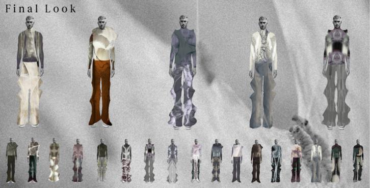 设计理念:蚕和石蚕,这两种昆虫具有不同筑巢方式,通过这两种不同的生物给我带来了关于服装轮廓和印花的灵感。在服装设计中,我通过这两点灵感对服装进行设计,大胆将生物建筑与服装设计结合。
