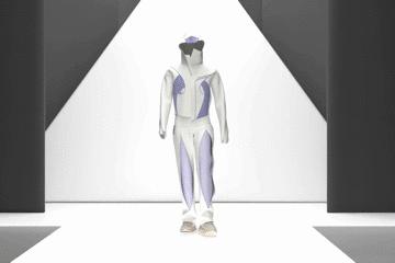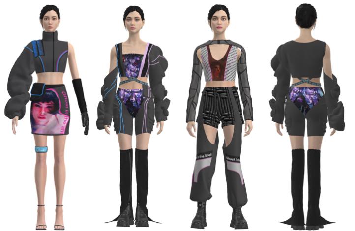 设计理念:设计灵感源于电影《攻壳机动队》,电影当中赛博世界的景象让我印象深刻,因此蓝紫的霓虹灯光成为我设计的主色调,我将女主角的形象做了二次创作,比如印花设计和面料拼接等工艺的穿插使用,来完成与机械感融合的现代女性运动时装。