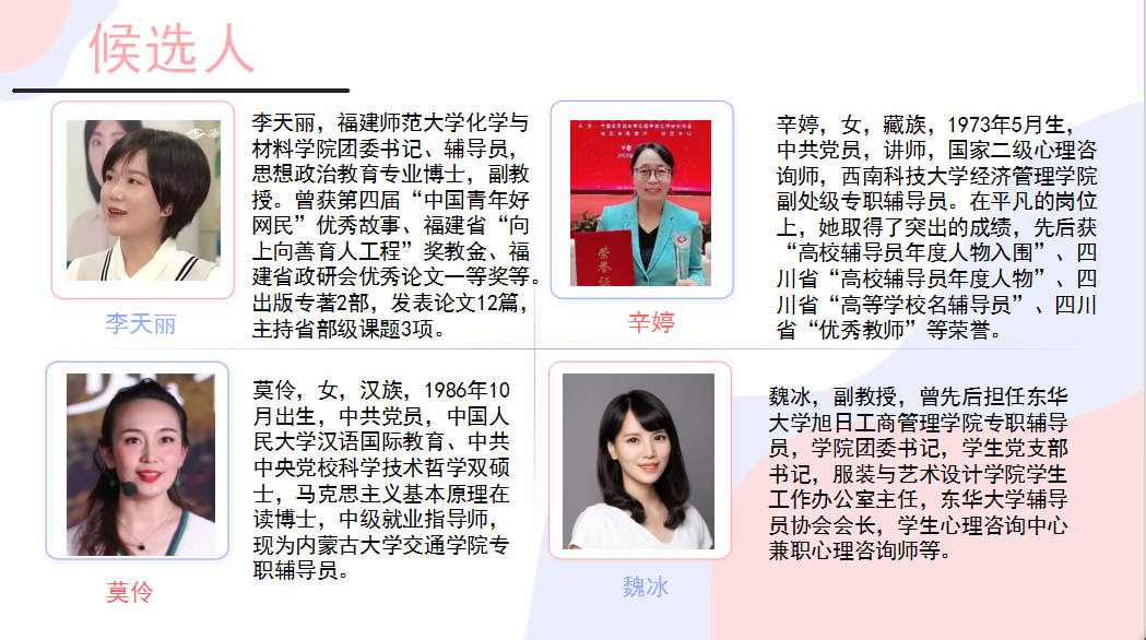 四是担任东华大学旭日工商管理学院专职辅导员魏冰老师。她坚持以学生为中心,做发挥网络育人优势的名师专家,与时代同行,创建“sunshine微课工作室”,润物无声塑品味;不同场域构建红色课堂,成为沪上高校辅导员讲党史的最“红”先行者,拓展三尺讲台,让党史学习教育“活起来”“潮起来”,掷地有声塑品行;挚爱学生14年,她是学生心中“最懂学生”的好老师和最信任的心灵守护者,将心理元素融入思政教育,化危机,促发展,用爱守护塑品格。