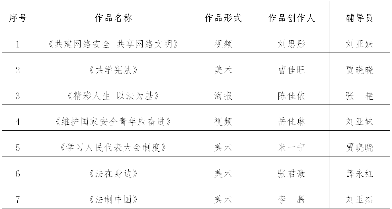 自征集活动启动以来,各班级积极响应,热烈参与,指导老师严格把关,确保每一件作品都内容严谨且创意独到。经过筛选,挑选出海报类作品20幅,文章类作品27篇。在此基础上,学工办经过进一步严谨细致的审核,最终遴选出7部作品推荐校级参赛。7名同学的作品凭借其出色的创意和深刻的法治内涵,荣获校级法制类优秀作品奖。同时,艺术学工办也被授予优秀组织奖。获奖名单如下: