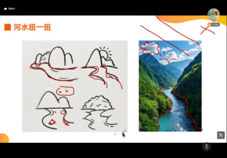 随后,学生讲师开始讲解简单的风景与动物绘画技巧。从线条的运用、色彩的搭配到构图的技巧,讲师都进行了细致入微的讲解,并通过示范画让同学们直观感受绘画的魅力。同学们目不转睛地盯着屏幕,认真聆听每一个细节,不时在纸上记录下重要的知识点。