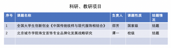 科研项目获奖:全国大学生创新创业《中国传统纹样与现代服饰相结合》已结题。