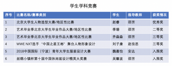 学科竞赛:北京大学生人物造型大赛赛前准备、全国艺术毕业季毕业作品大赛赛前准备、WWE NXT选手“中国之星王彬”舞台人物形象设计比赛赛前准备、丝绸小镇杯第十届中国休闲装设计精英大奖赛赛前准备、2018中国国际(宁波)青年大学生服装设计大赛赛前准备,教师参加学科竞赛国内获奖8项、国际获奖7项。
