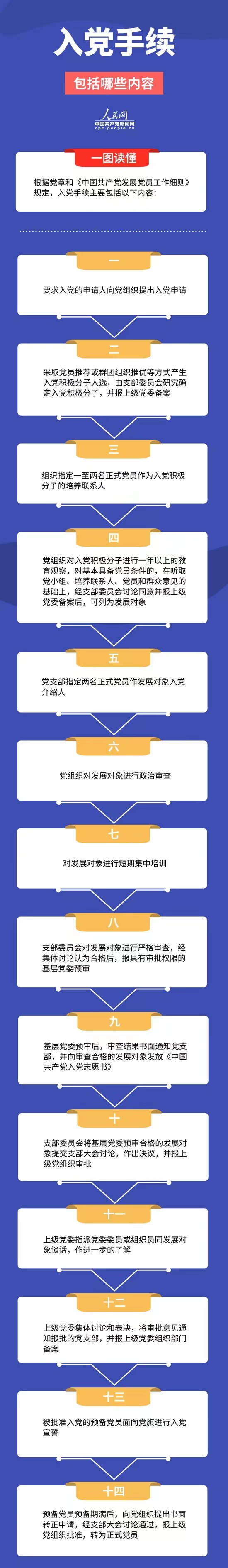 根据党章和《中国共产党发展党员工作细则》规定,入党手续主要包括以下内容: