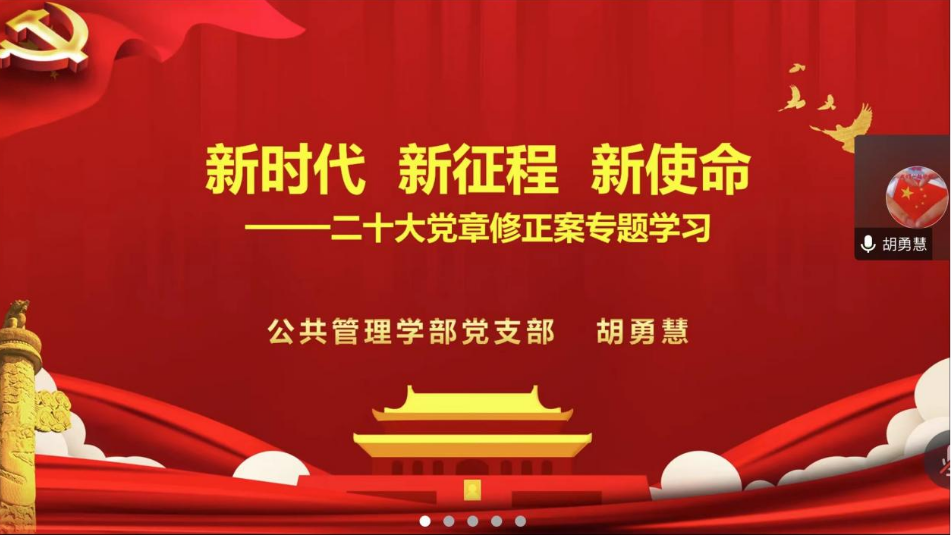 1月4日,公共管理学部党支部开展“新时代 新征程 新使命”二十大党章修正案专题学习活动,支部书记胡勇慧带领支部全体教师党员进行集体学习。