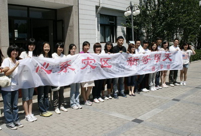 5月12日中午,由公共管理学部学生组织举办的“纪念汶川,展望明天”书信大赛启动仪式在教二楼前举行,学部广大师生参加了活动。活动中学生代表诵读了对灾区人民表达祝福的心语;过往的师生驻足于一条印着“心系灾区,新寄民间”的横幅前,签名为灾区的同胞祈福。