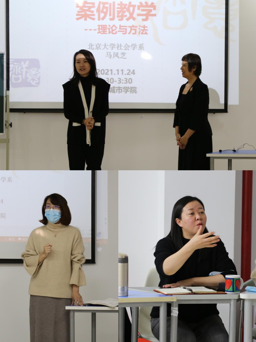 马凤芝教授围绕案例教学的规范与标准,从国家发展战略的角度,高屋建瓴地阐释了高校教育中推动案例教学方法与新阶段教育高质量发展任务的关系,回应了案例教学中的细节问题、分享了具体经验,提升了老师们开展案例教学的思想认识。李敏老师从课程分类建设管理和认定标准出发,分别从“一流课程”“混合课改”“课程思政”“创新课程”四个类别为学部教师进行了政策解读,从宏观层面为教师进行课程建设提供答疑和指导。戴庆教授针对“混合课改”建设,分别从混改课程申请、优慕课框架搭建、教学设计、教学组织等多个角度,为老师们提供了全面细致的演示和讲解。林霞副教授针对“案例教学”开展了案例教学示范课,以互动教学的形式,引导参训的老师对案例的选择、实施与评估进行思考和讨论。