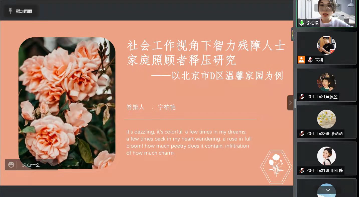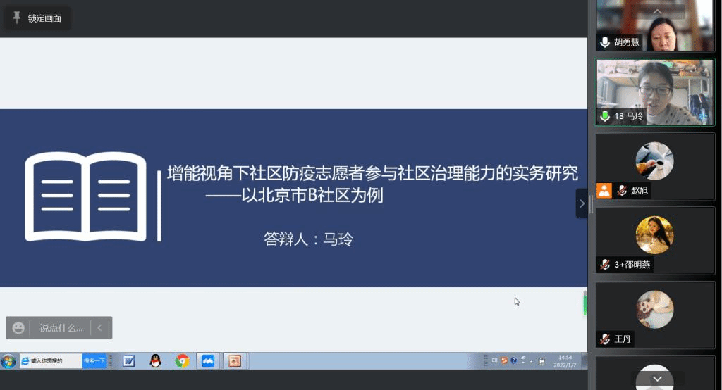 此次研究生中期答辩有12名校外高校、行业内专家和19名校内学术导师共同参与并担任答辩评委。2020级社会工作研究生共计87人参加中期答辩。答辩采取线上腾讯会议的形式进行,共分为6组,每组由1名组长,4~5名专家组成答辩评审小组来共同评议学生论文。