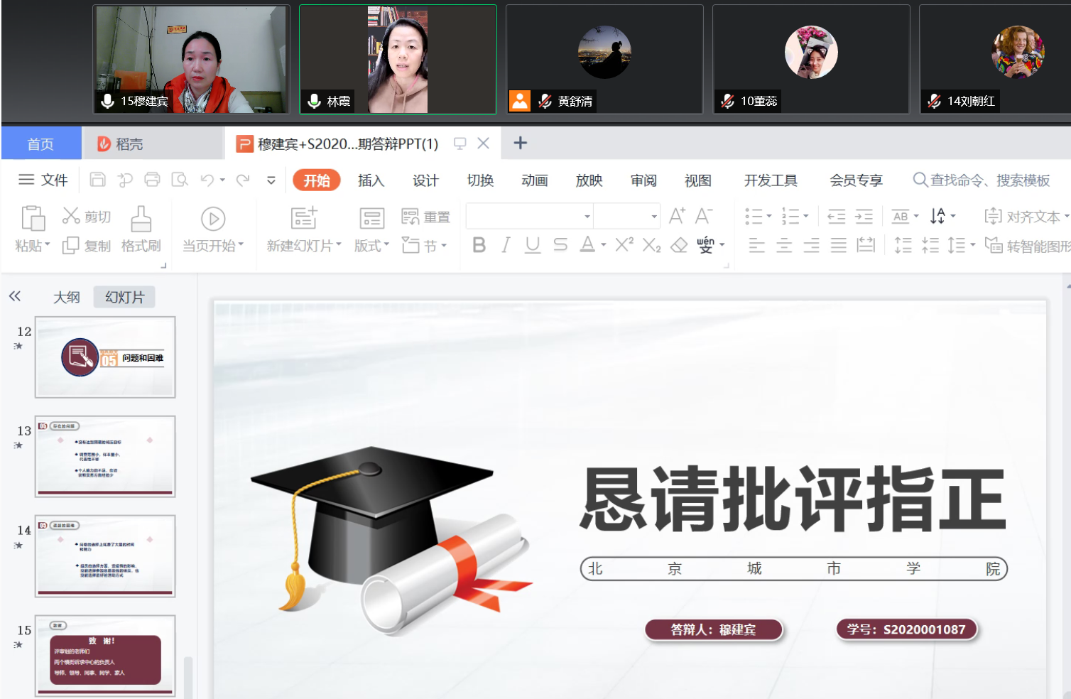 中期检查答辩会分研究生汇报、评审小组评价指导两个环节进行。同学们以PPT的形式就论文的进展情况进行了汇报,包括研究进度、内容、研究过程、存在问题等。答辩评审小组对硕士生的论文情况进行评议,并针对存在问题提出相应要求及修改意见。