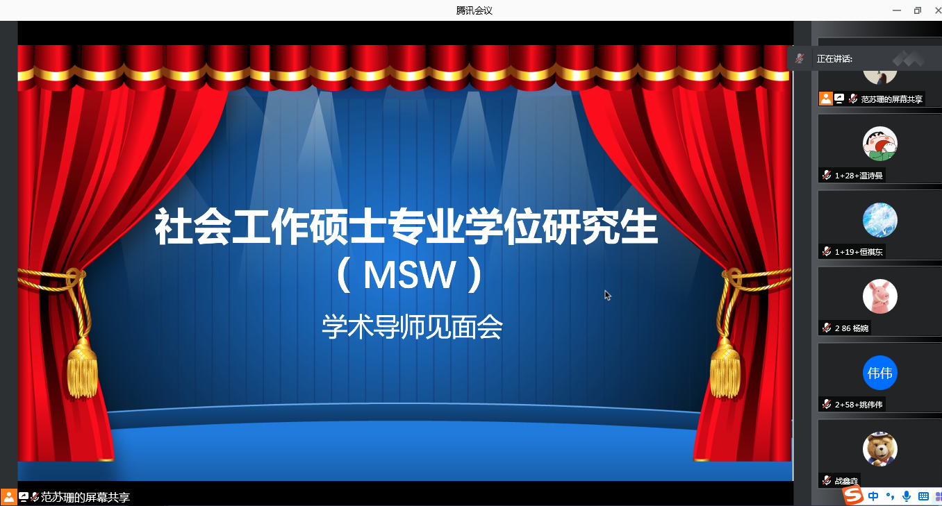 2022年1月15日,公共管理学部MSW教育发展中心举行2021级研究生导师见面会暨“如何做好社会工作专业硕士(MSW)的学位论文”培训讲座。公共管理学部主任张会莹老师、公共管理学部书记胡勇慧老师、公共管理学部副主任娄缤元老师、全体研究生学术导师与2021级研究生,共计101人参加会议。