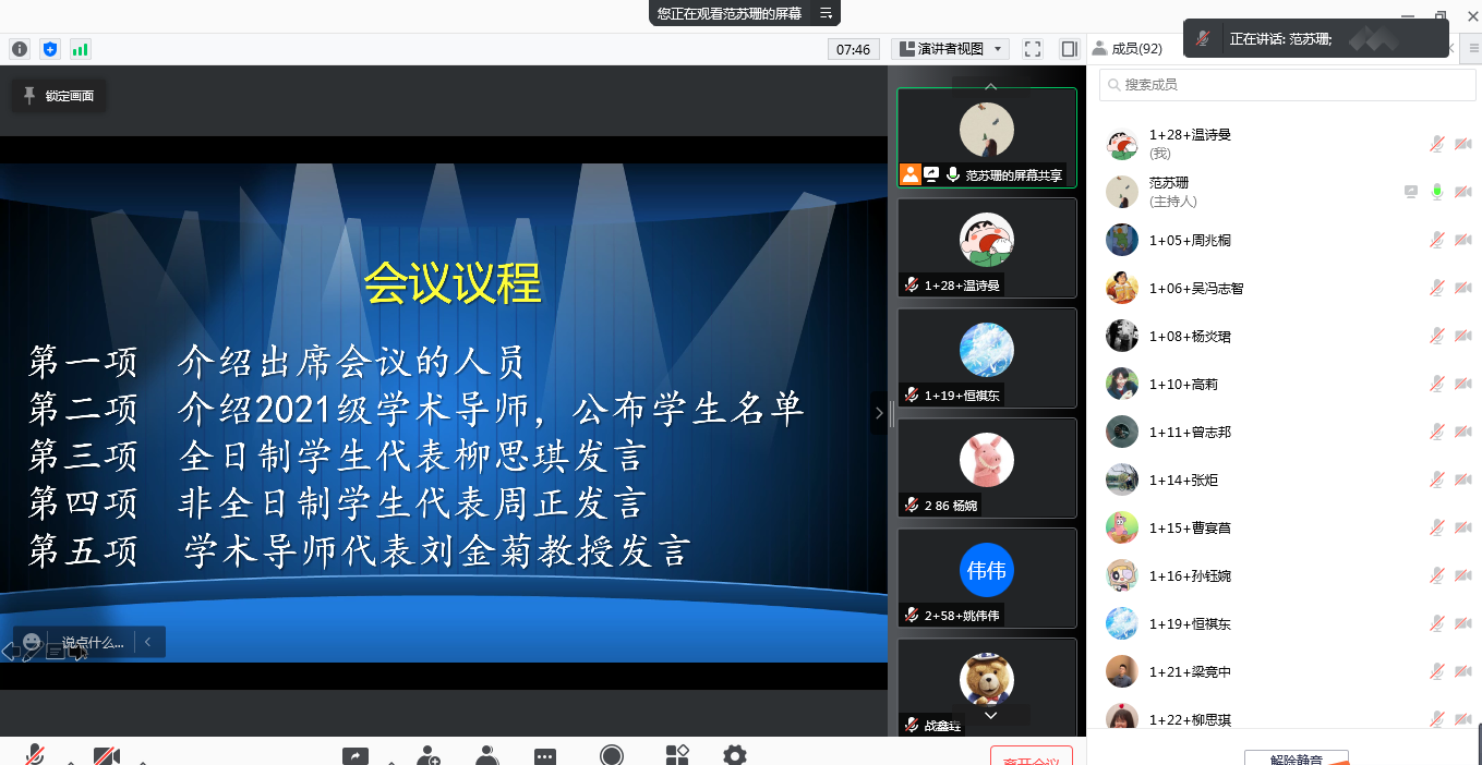 会议共分为三个环节,首先,全日制研究生代表柳思琪同学表达了作为“M宝贝”的一员内心十分骄傲和自豪,感谢学校提供的良好的学习环境和教学资源,一定会跟随导师踏实学习,相信能收获属于自己的专业成长。非全日制研究生代表周正同学表示作为在职同学格外珍惜学习的机会,一定会全力以赴,向学校、老师、自己交上一份满意的答卷。学术导师代表刘金菊教授希望同学们能够在两年研究生生活中不留遗憾,合理规划、不怕付出、真诚待人、坚守学术道德底线、让读书与思考成为一种生活方式,驻守初心,最终扬帆起航。