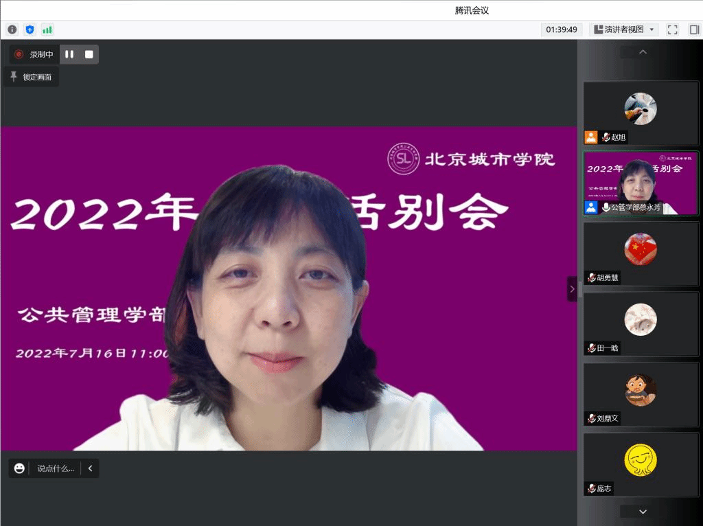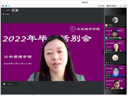 2022年7月16日,公共管理学部线上开展了2022届社工专业毕业生话别会。会议由社会工作专业主任蔡永芳老师主持,学部领导、专业教师、2022届社工专业全体学生参加。党支部书记胡勇慧、班主任白艳娜,专业导师庞志,校友代表刘鼎文分别线上寄语,将祝福定格,将希望定格。