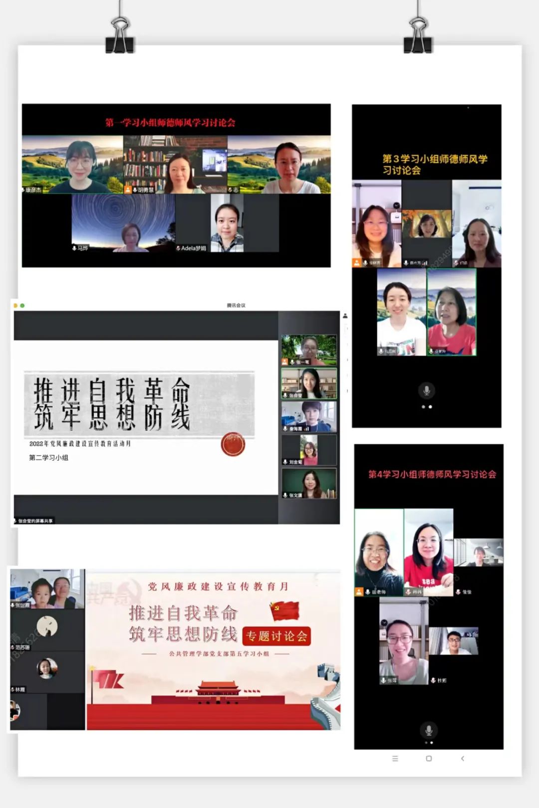 在师德师风建设大讨论阶段,5个党员学习小组开展了学风、教风、作风大讨论,党员们结合当前疫情防控背景和线上教学指导特点,展开热烈讨论。