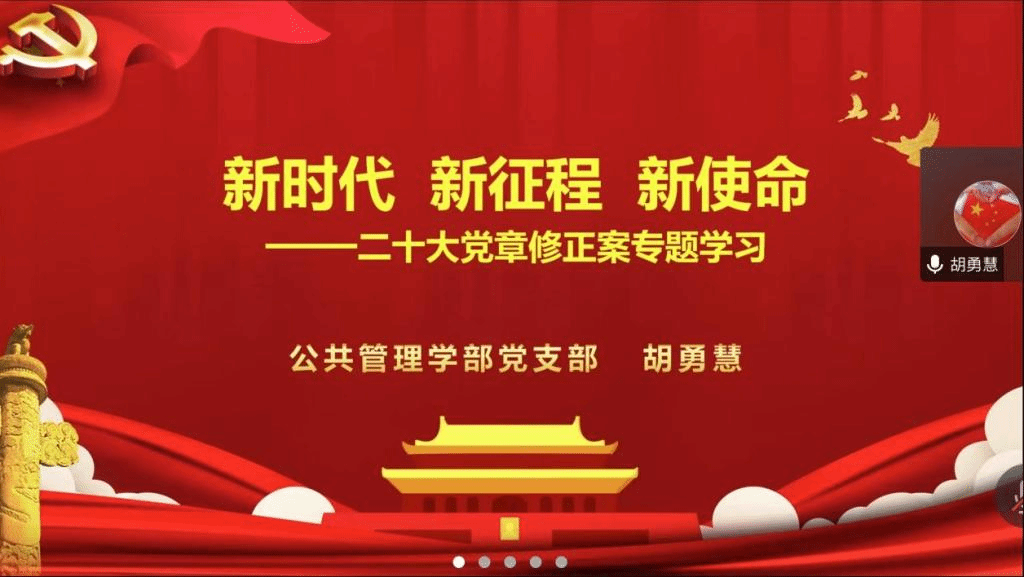 1月4日,公共管理学部党支部书记胡勇慧以“新时代新征程新使命”为主题讲党课,支部全体教师党员围绕“二十大党章修正案”集体学习。