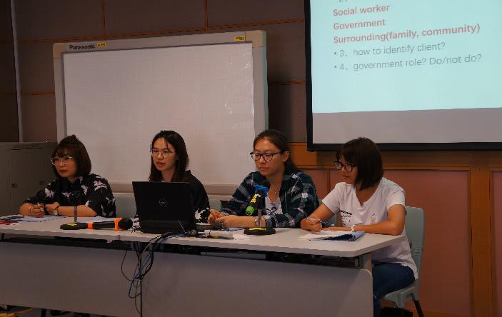 图4为交流团“家庭服务研究小组”用英文向实习督导主任做本次培训交流汇报工作