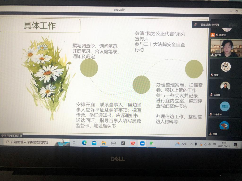 2023年1月11日早上八点,公共管理学部组织了2023届本科生专业岗位实习总结汇报,涉及社会工作和法学两个专业,专业实习督导老师和汇报学生共同参会。由宋利和陈汶佳两位老师分别主持社工和法学专业汇报组。
