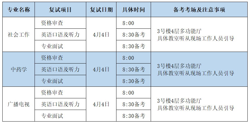 注意:请考生务必在备考教室仔细查看本专业复试的流程与安排,听从现场工作人员的引导。公共管理专业待定。