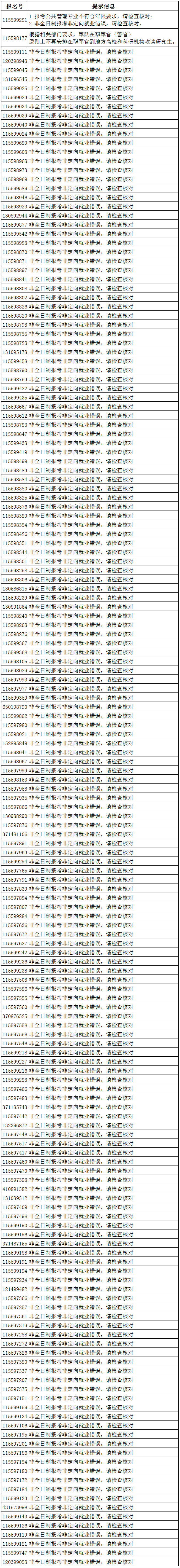我办将不定期更新各类存疑名单,请各位考生密切关注。本通知仅做提醒用,出现在本通知名单中的考生请仔细核对报名信息和自身条件是否符合报名规定;受筛选功能限制,无法一次性将所有存疑信息筛出,未出现在名单上的考生不代表网报信息没有问题,也请仔细阅读招生简章、考点公告、网报公告进行自我核对。