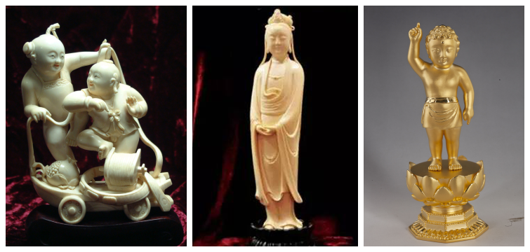 象牙雕刻是一门古老的中国传统艺术,向以仙姿媚态的古装仕女和秀丽动人的圆雕花卉见长,形成了高雅、古朴、精细、 遒劲的独特艺术风格。牙雕制作要经过凿、铲、开脸、磨、彩熏等五道工序:凿,就是开坯成形;铲,即精细加工;开脸,是做人物面部细致表情;磨,作精细的抛光;彩熏,根据不同的要求,对作品进行染色处理,或熏制成仿古产品。雕刻手法也是多种多样的,主要运用深浅浮雕、镂空雕和立体圆雕。