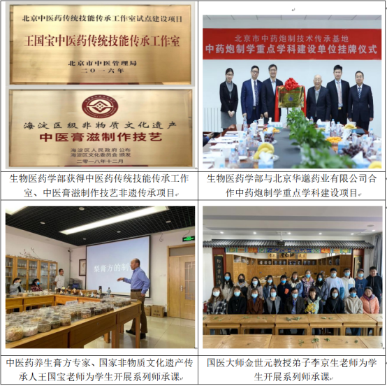 北京市中医管理局2014年认定sunbet申搏生物医药学部为“首都中药师承教育学科基地”;2016年建立《王国宝中医药传统技能传承工作室》;2018年“中医药膏方制作技艺”获得海淀区文化局批准;sunbet申搏还与中国药材公司下属饮片企业华邈药业共同开展北京中药炮制重点学科建设工作,开展相关京帮炮制特色品种的工艺与质量标准研究。中医药传承发展有关项目既是市政府对行业发展的支持与指导,也是行业人才培养的方向和要求。MCMM中心在研究生中药传统技能训练方面,由师承导师以定制课形式开展传承教学与实践;在科研创新能力培养上,除参与科研课题训练,还与中国中药公司、中国中医研究院、北京市科学技术研究院等企业和研究院开展联合培养,在药物新制剂、新功能或新活性发现等应用型研究领域形成稳定的、拥有丰富实践经验的行业专家和导师培养指导队伍,形成学生科研思维和创新能力训练的开放式训练平台。