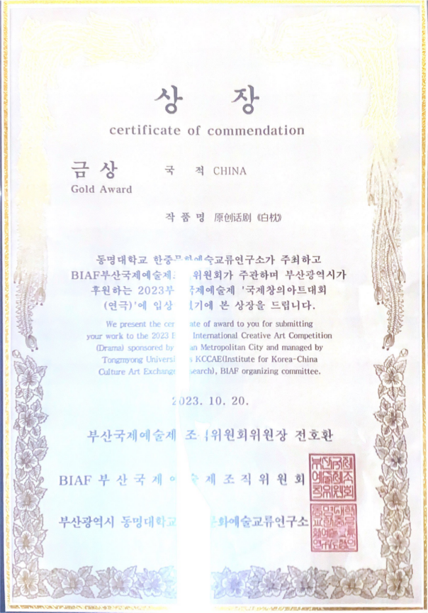 原创话剧《白枕》获得釜山国际艺术节全球总决赛金奖