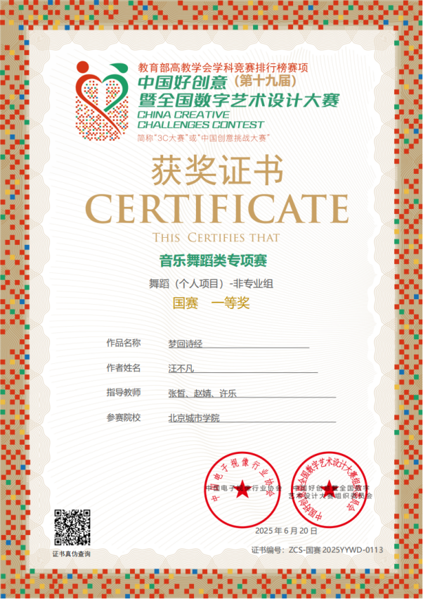 原创舞蹈作品《梦回诗经》荣获中国好创意(第十九届)暨全国数字艺术设计大赛音乐舞蹈类专项赛国赛一等奖