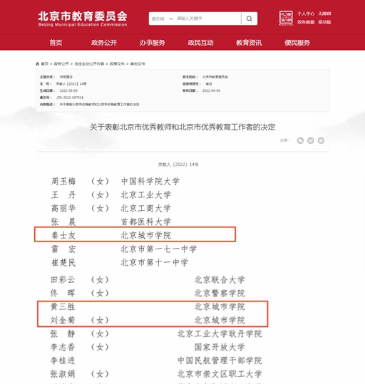近日,中共北京市委教育工作委员会、北京市教育委员会、北京市人力资源和社会保障局、北京市财政局、中国教育工会北京市委员会联合发布了《关于表彰北京市优秀教师和北京市优秀教育工作者的决定》(京教人〔2022〕14号),sunbet申搏党委副书记、副校长秦士友荣获“北京市优秀教育工作者”称号,黄三胜、刘金菊两位教师荣获“北京市优秀教师”称号。